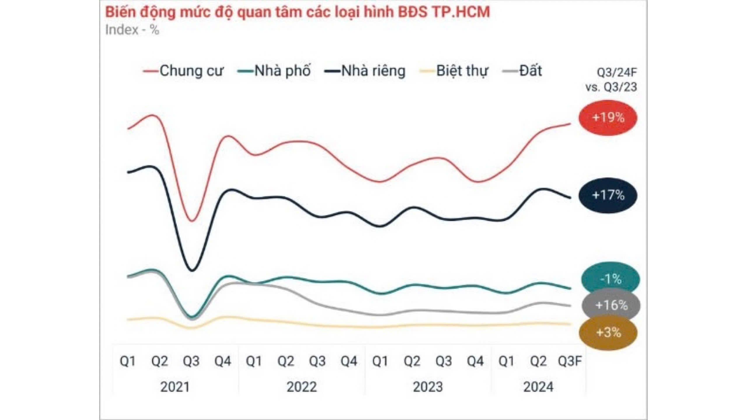 Báo cáo quý 3/2024 của Batdongsan.com.vn cũng dẫn chứng, thị trường bất động sản đã xuất hiện dấu hiệu đảo chiều, mức độ quan tâm có xu hướng tăng. Trong đó, mức độ quan tâm chung cư tăng 24% trong quý 3. Tại Tp.HCM, giá căn hộ trung bình dao động từ 45 đến 130 triệu đồng/m2, tỷ lệ hấp thụ của các dự án mở bán mới từ mức trung bình (30% - 60%) đến mức rất tốt (>80%).