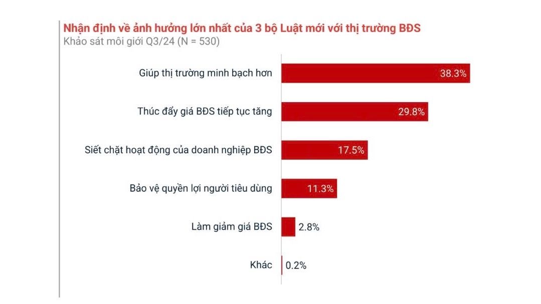 Theo ông David Jackson, các chi phí liên quan đến đất đai, vốn phát triển dự án dự báo tăng hơn nữa khi Luật Đất đai 2024 (sửa đổi), Luật Nhà ở, Luật Kinh doanh bất động sản có thông tư, hướng dẫn áp dụng. Bài toán cân đối nguồn vốn để phát triển dự án cũng sẽ phức tạp hơn khi luật mới quy định mức đặt cọc không quá 5% tổng giá trị bất động sản. Vì vậy, giá bất động sản khó giảm trong ngắn hạn.