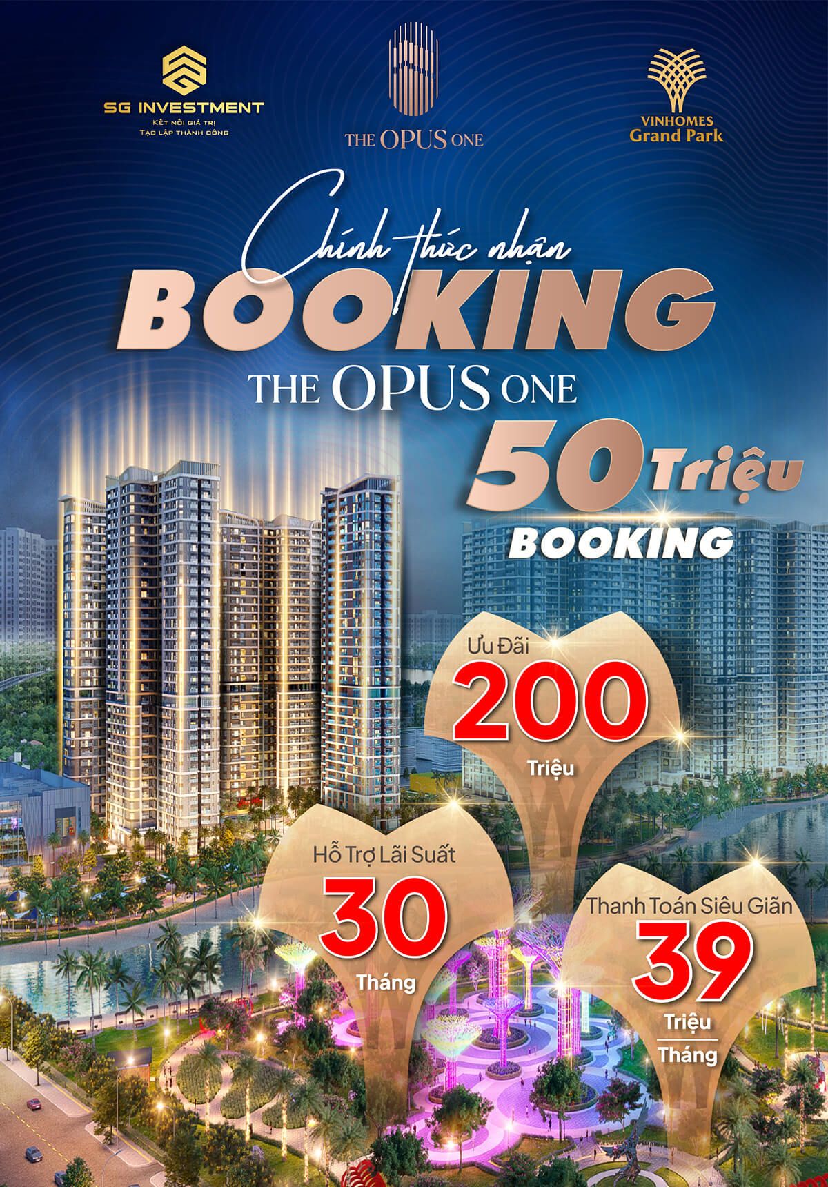 The Opus One – Mảnh ghép đẳng cấp cuối cùng tại đại đô thị đáng sống nhất Sài Gòn, Vinhomes Grand Park đã chính thức ra mắt thị trường với hàng loạt chính sách có 1-0-2 dành cho những chủ nhân tinh hoa: ƯU ĐÃI 200 TRIỆU ĐỒNG cho khách hàng đặt cọc sở hữu sớm căn hộ The Opus One sang trọng trong tuần lễ vàng từ 29/8 - 4/9.