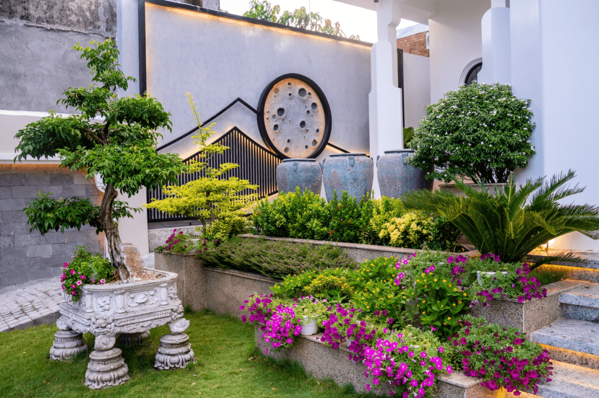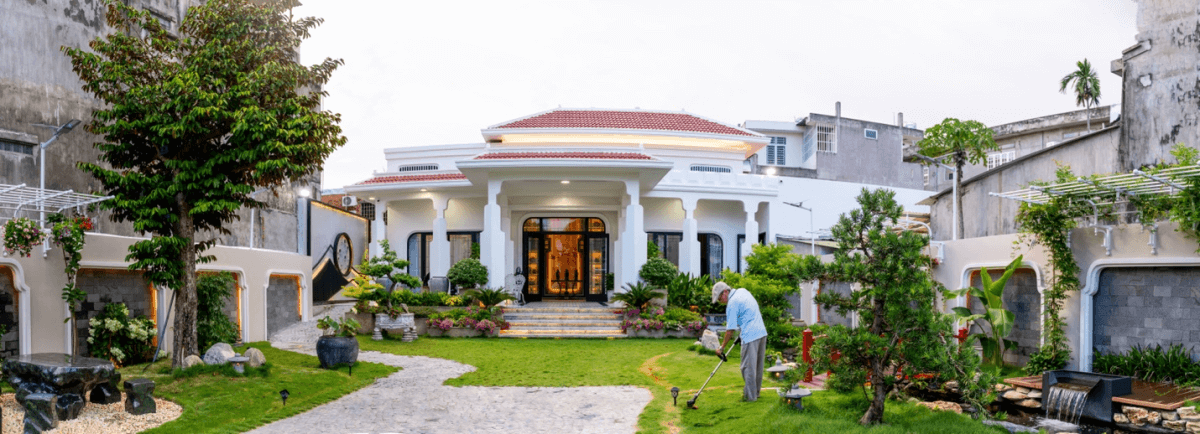 Sân vườn phía trước nhà trồng nhiều cỏ và cây xanh, các mảng tường thi công cách điệu. Công trình do Workbee Decor thiết kế, có thời gian thi công trong 4 tháng. "Sự kết hợp giữa truyền thống và hiện đại này tạo ra một môi trường sống vượt thời gian và để ngôi nhà là nơi tụ hội của nhiều thế hệ gia đình, truyền lại cảm hứng vui sống và trở về", đại diện Workbee Decor chia sẻ.