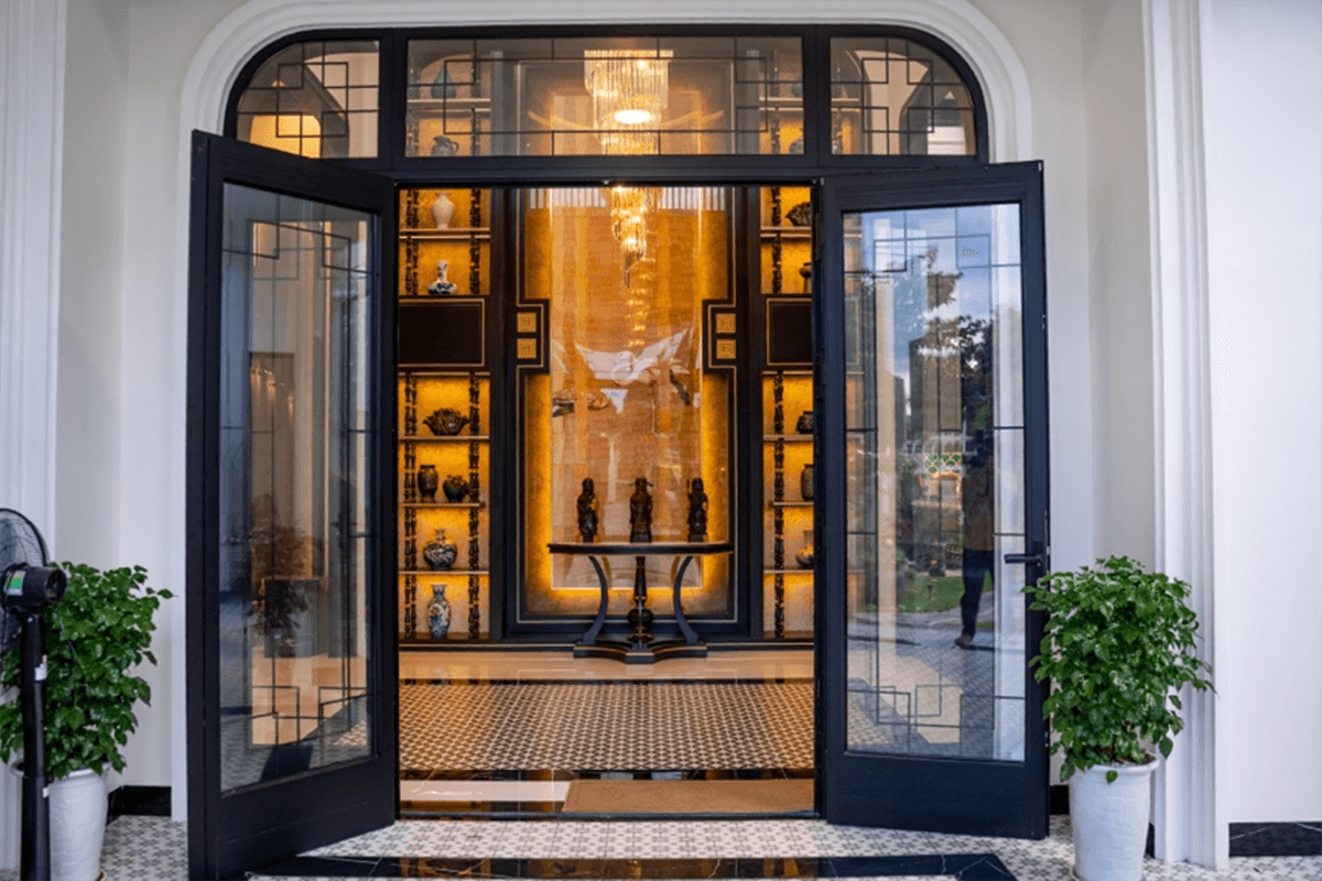 Hệ cửa thiết kế hai lớp, với khung kính bên trong và lá sách bên ngoài, không chỉ mang lại tính thẩm mỹ mà còn có tác dụng lấy sáng tự nhiên, chắn gió mưa vào mùa đông và tạo điều kiện lý tưởng để lấy gió vào trong ngôi nhà vào mùa hè. Điều này giúp duy trì sự thoáng đãng và tiết kiệm năng lượng.