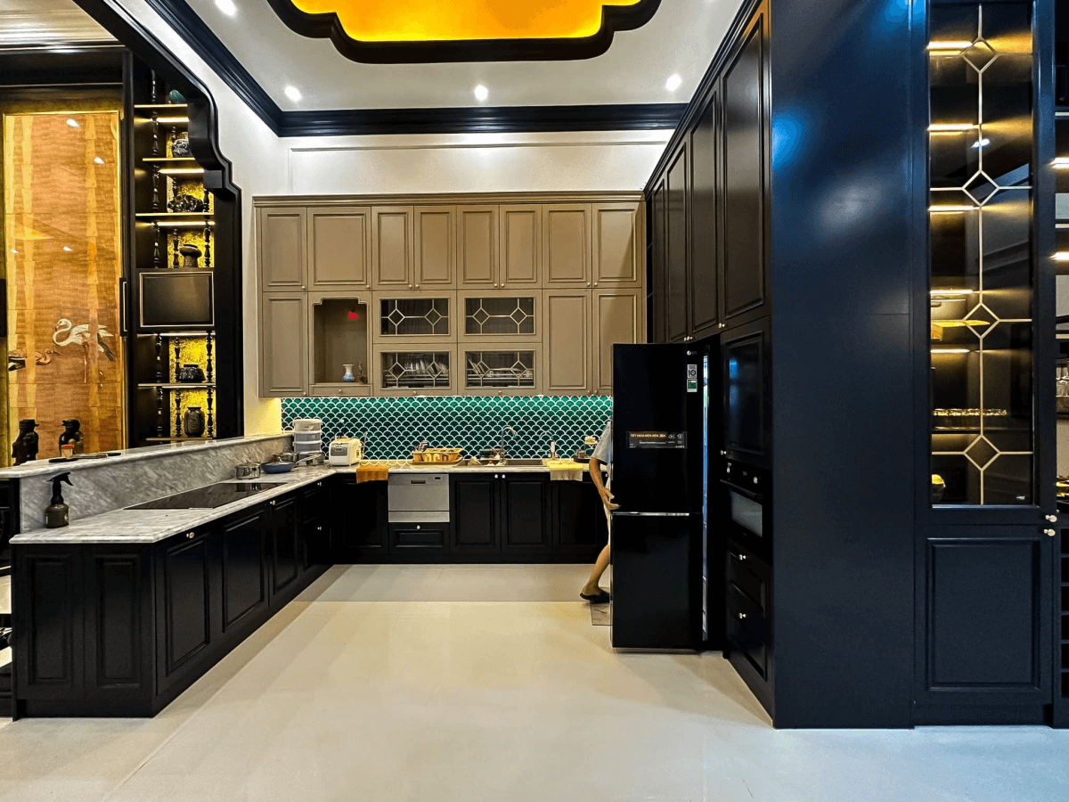 Gian bếp với thiết kế rộng rãi, bố trí nhiều thiết bị hiện đại đảm bảo tính nhất quán trong phong cách Indochine. Các chi tiết trong nhà sử dụng chất liệu gỗ tự nhiên, được xử lý qua các bước chống mối mọt cong vênh để thích nghi được với khí hậu nóng ẩm và mưa nhiều của thành phố duyên hải.