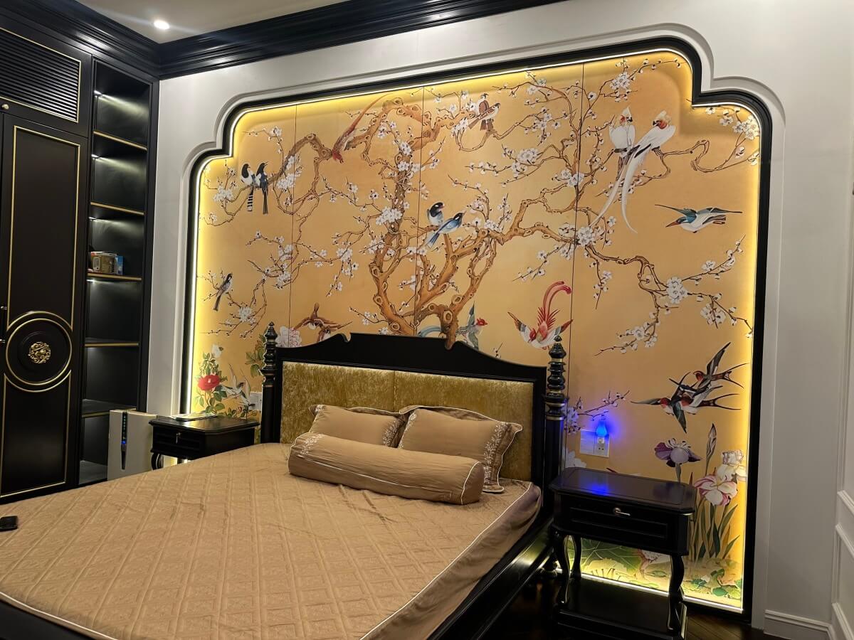 Thiết kế của chim hạc len lỏi trong từng chi tiết nội thất của ngôi nhà, tạo ra không gian vừa gần gũi vừa tinh tế, mang đậm nét văn hóa Phương Đông. Ví dụ, tủ sơn mài sử dụng gỗ tối màu, kết hợp với thiết kế sơn mài thủ công, được trang trí bằng những đường chạm khắc tinh xảo và đường cong trang nhã, tạo nên một điểm nhấn quý phái cho không gian nội thất