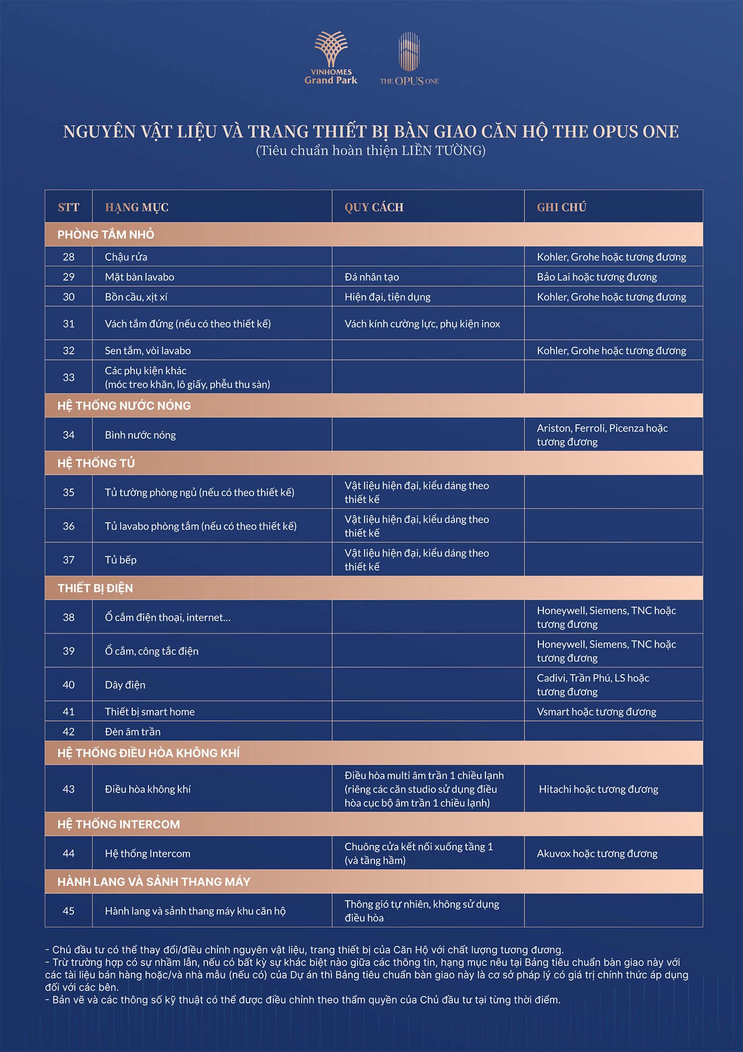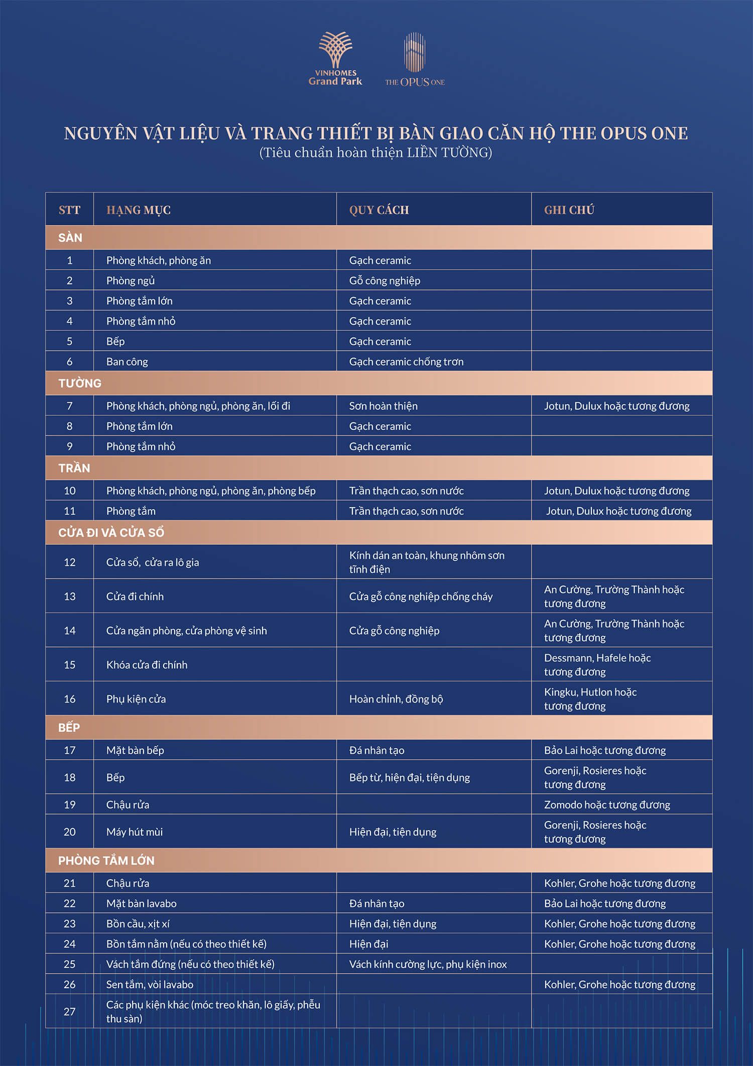 TIÊU CHUẨN BÀN GIAO THE OPUS ONE